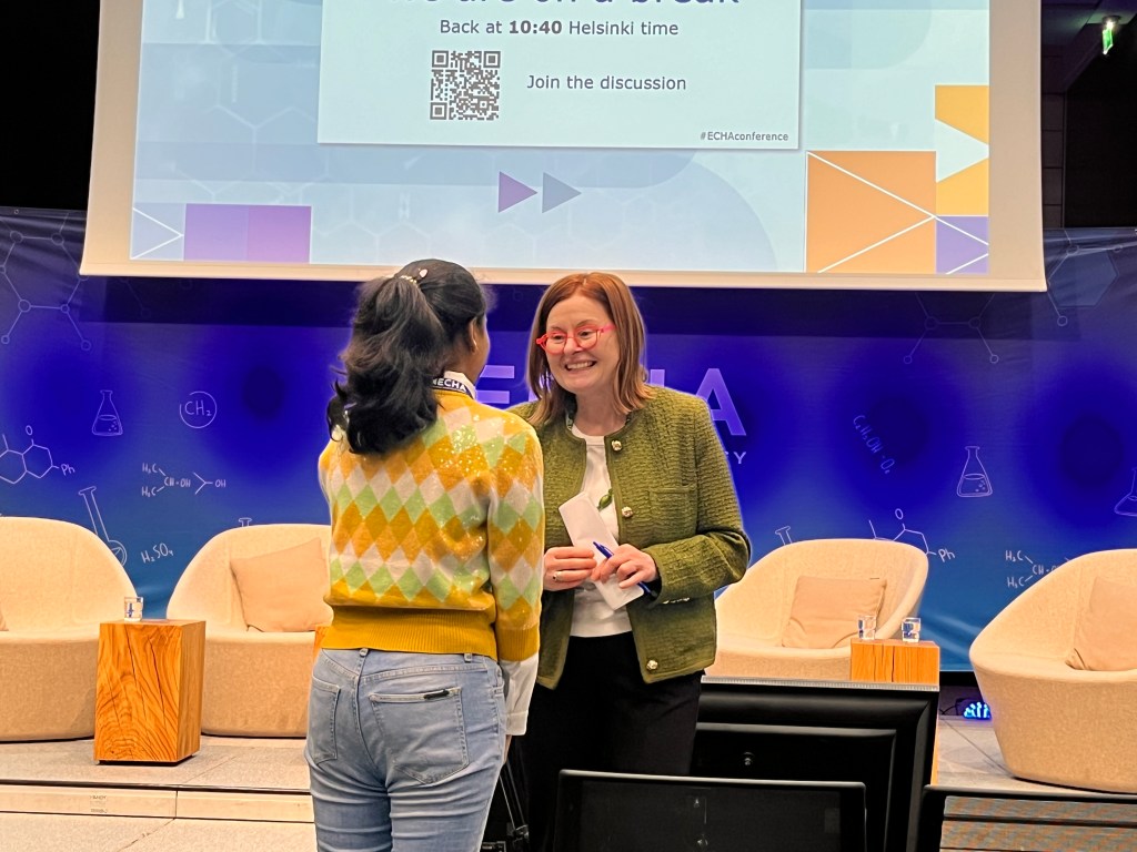 The conference had a sharp 9am start with the introduction and welcome keynote by Virginijus Sinkevicius (EU Commissioner for Environment, Oceans & fisheries), followed by another keynote by Juhani Damski (Permanent Secretary Ministry of Environment, Finland). I was eagerly waiting for the speech from Sharon Mccguiness (Executive director of ECHA), who I also managed to catch up with during one of the break sessions.